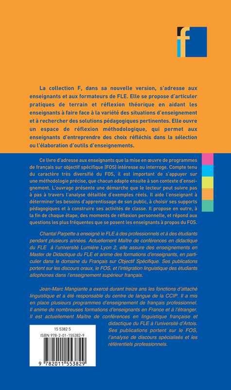 L'objectifs des auteurs est d'amener les enseignants à maîtriser la conception de programmes de français sur objectifs spécifiques, d'une part en se familiarisant avec une démarche globale, d'autre part en menant une réflexion sur l'adaptation de cette démarche-type à leurs situations particulières. Le modèle mis au point en FOS, fondé sur l'analyse des besoins, la collecte de données et l'élaboration de cours est un modèle exigeant dans sa version idéale.